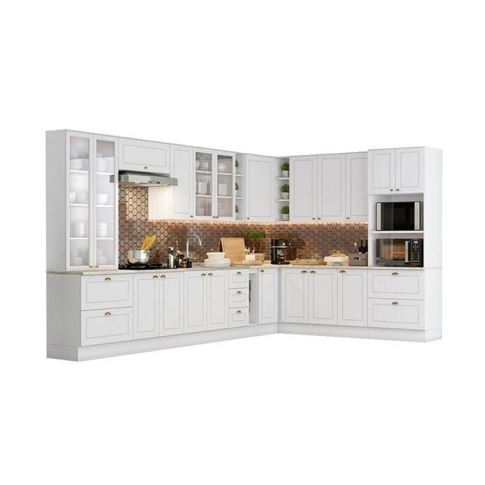 Esse modelo é composto por armários, gavetas, prateleiras, balcão e pia, oferecendo tudo o que é necessário para equipar a cozinha.