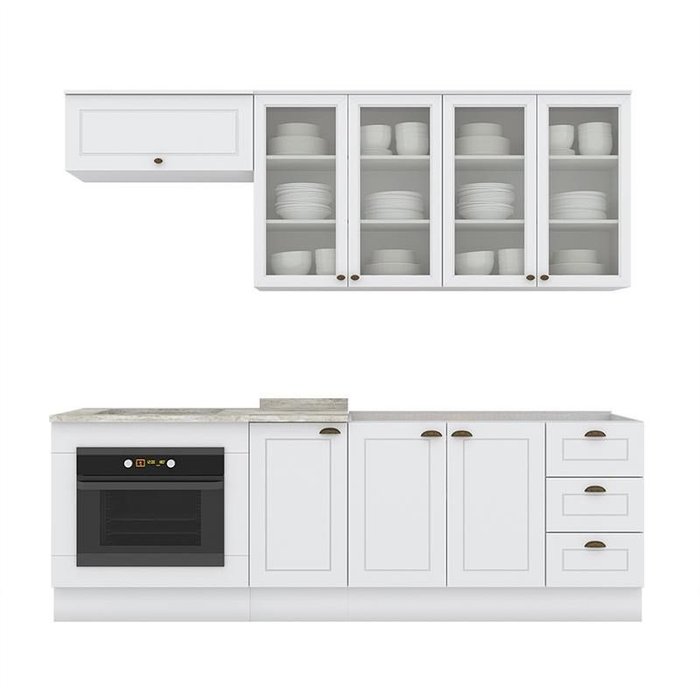 Esse modelo é composto por armários, gavetas, prateleiras, balcão e pia, oferecendo tudo o que é necessário para equipar a cozinha.