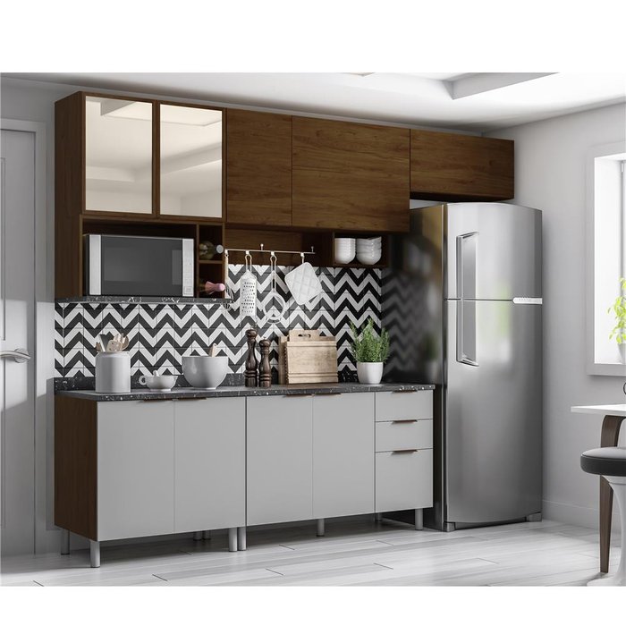 E quem se preocupa com a estética poderá ficar tranquilo, porque as peças também dispõem de nichos para objetos de decoração e acessórios, puxadores em alumínio discretos e resistentes, duas portas de vidro, suporte para pendurar utensílios e uma coloração incrível que ajuda a trazer mais aconchego, sofisticação e elegância para o ambiente.