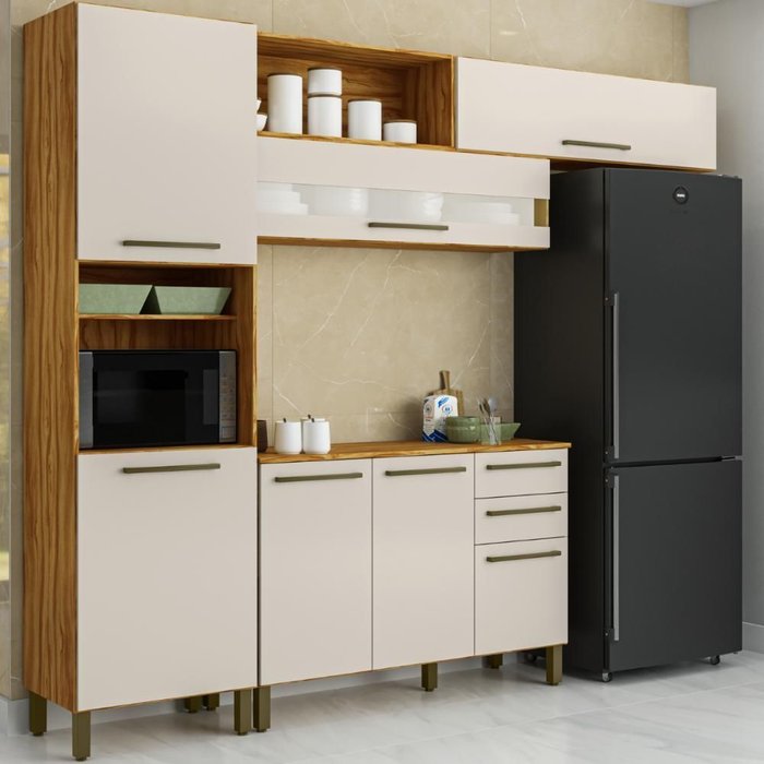 Cozinha Completa Carmenere 7 Portas 2 Gavetas Armário Balcão e Nicho 100% Mdf Amendoa/Off White