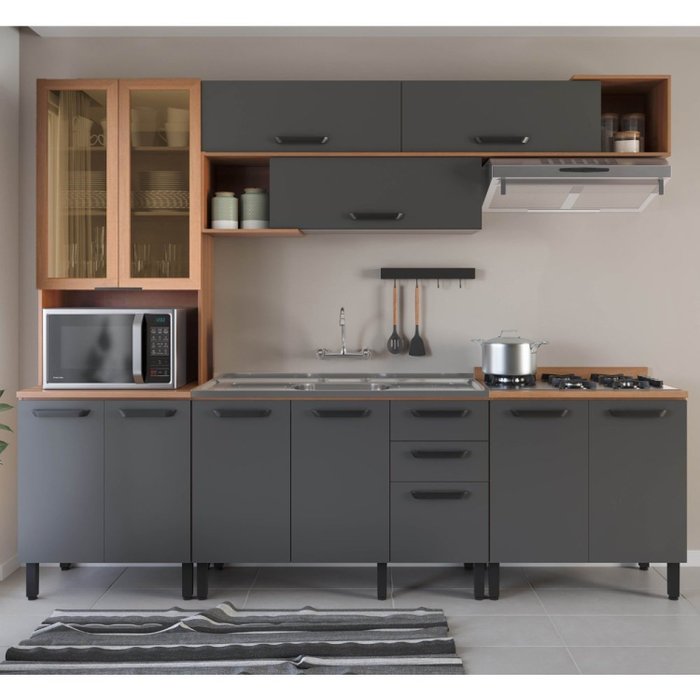 Cozinha Completa com Balcão e Armários Aéreos Freijó/Grafite