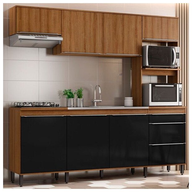 Cozinha Completa Compacta Paola 246cm 8 Portas 2 Gavetas Mdp Mel Preto - Clicklar Fosco Mel e Preto Brilho