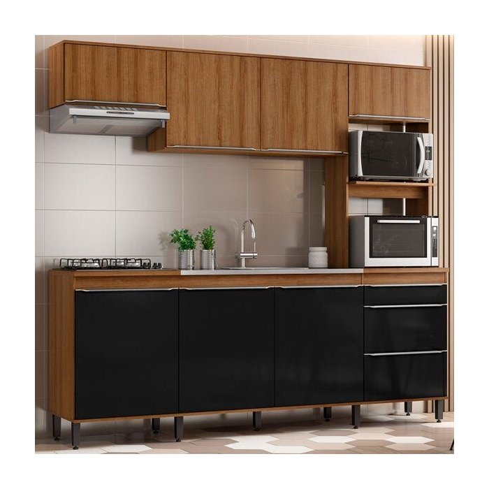 Cozinha Completa Compacta Paola 246cm 8 Portas 2 Gavetas Mdp Mel Preto - Clicklar
