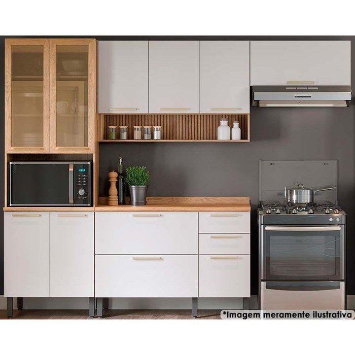 Cozinha Completa Completa Thela Avelã (2 Aéreos, 1 Balcão, 1 Paneleiro) 4 Peças Mel/Branco -