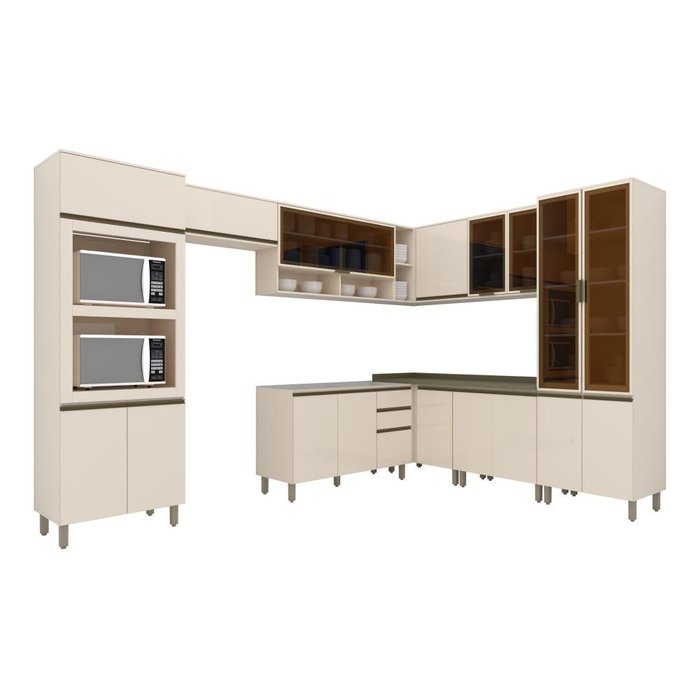 Cozinha Completa de Canto Connect 9 Peças Off White com Torre Quente e Cristaleira - Móveis Henn
