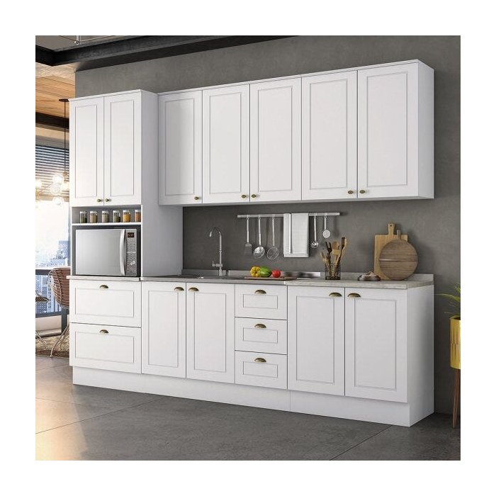Esse modelo é composto por armários, gavetas, prateleiras, balcão e pia, oferecendo tudo o que é necessário para equipar a cozinha.