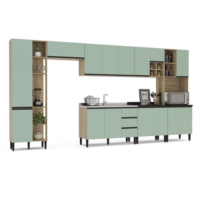 Cozinha Completa Modulada 15 Portas 3 Gavetas Talharim Lâmina Mel/Verde Bellagio