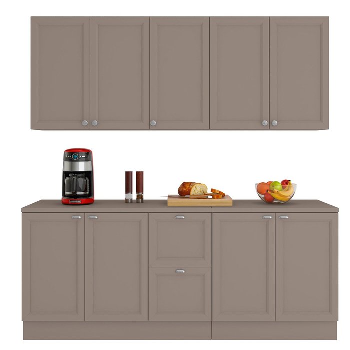 Esse modelo é composto por armários, gavetas, prateleiras, balcão e pia, oferecendo tudo o que é necessário para equipar a cozinha.