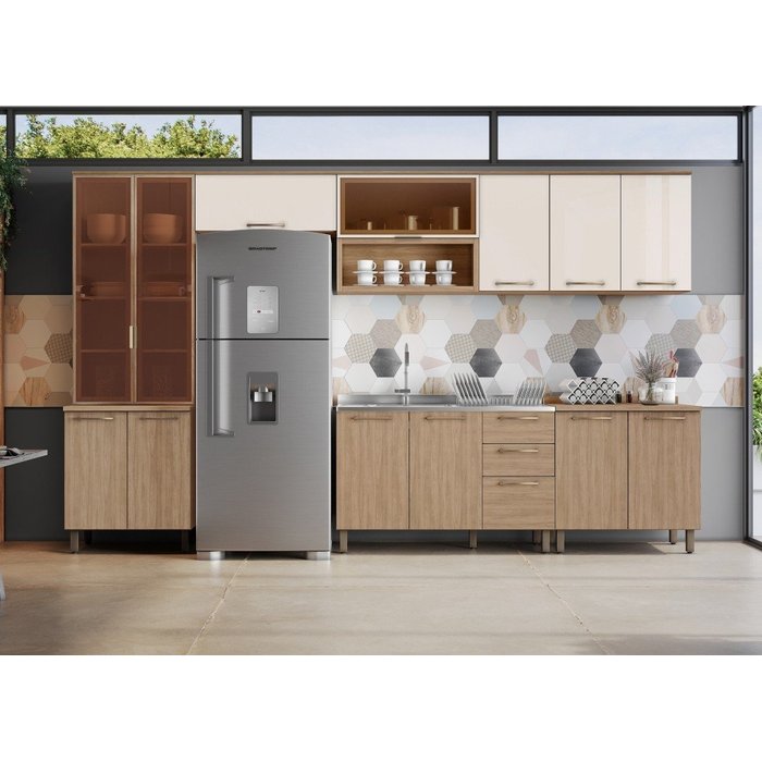 A Cozinha Zafira garante um ar de requinte e sofisticação. Na cor Jequitibá Off White e o design clean, é feita 100% em MDP, vidros Reflecta, as corrediças das gavetas são telescópicas. Já os pés na cor Bronze facilitam a limpeza, mas você também pode optar por usá-la suspensa.
