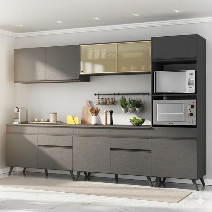Itens Inclusos 1 armário aéreo 120cm 1 armário aéreo com portas de vidro 120cm 2 balcões com tampo 120cm 1 armário para forno e micro-ondas 62cm