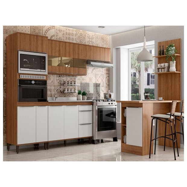 Cozinha Completa Modulada Ilha Gourmet 268/135cm 6 Peças 10 Portas 3 Gavetas MDP Mel Branco - Clicklar Fosco Mel e Branco Brilho