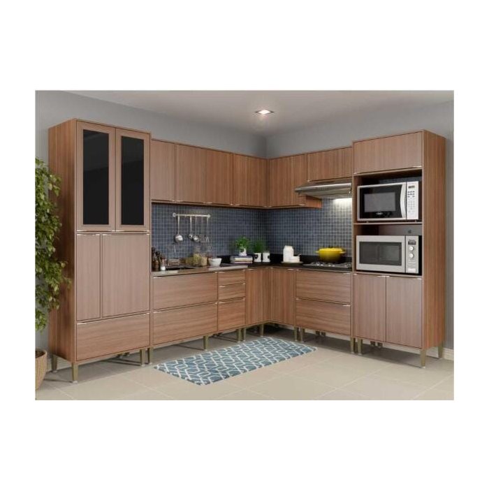 A cozinha é o local de experiências, convivências, gostos e aromas. Pensando nisso, a Multimóveis lançou a linha Calábria, uma nova alternativa de cozinhas moduladas. Com design moderno e atemporal, com detalhes projetados para trazer praticidade e funcionalidade a você. Cada ambiente conta uma história, que tal começar a sua com essa Cozinha completa Calábria? Montamos essa opção pensando no melhor pra sua casa! A Cozinha Calábria é composta por: - 01 Paneleiro Duplo com Porta Temperos 70 cm- 01 Aéreo Triplo 120 cm- 01 Aéreo de Canto Reto- 01 Aéreo Basculante 70 cm- 01 Módulo para Forno e Microondas 70 cm- 01 Balcão com tampo 120 cm- 01 Balcão de Canto Reto - 01 Balcão Duplo 70 cm- Manual de montagem - Certificado de Garantia: 03 meses contra defeito de fabricação Porque comprar a Cozinha Calábria? Porque é uma cozinha sofisticada e com um amplo espaço interno para auxiliar na praticidade do dia a dia. As opções de rodapés e a variação de módulos, trazem ao ambiente um ar de projetado. Material: MDPO que é o MDP? O MDP é produzido em três camadas: uma grossa no miolo e duas finas nas superfícies. Essa composição garante ao produto grande resistência estrutural, conferindo maior resistência ao empenamento e à colocação e remoção de parafusos, além de torná-lo um material mais leve. Possui alta absorção de tinta no acabamento final. Detalhes Técnicos: Descrição: Kit Cozinha 8 MódulosCor da Caixa: NogueiraCor das Portas: NogueiraAcabamento: Acabamento Finish FoilPortas: 19Tipo de portas: 12 Portas de Abrir e 06 Portas BasculantePorta com vidro: NãoGavetas: 4Prateleiras: 13Corrediça: Telescópica de AçoPuxador: AlumínioPistão a Gás: SimInclui Tampo no Balcão de 120 cm: Não incluiTampos nos demais balcões: Não incluiPés: Com regulagem de altura em polipropilenoPossui rodapé: NãoEspaço para microondas ou forno: Sim - Microondas: 45,5 x 66,9 x 49,5 cm / Forno: 45,2 x 66,9 x 49,5 cm DIMENSÕES: Altura (cm): 210Largura (cm): 276,5Profundidade (cm): 226,5 Instruções de Cuidado: Limpar com pano seco para retirar o pó. Favor não utilizar produtos químicos ou abrasivos na limpeza. Não recomendado aplicar lustra móveis. Observações: - O produto será entregue desmontado e a Multimóveis não disponibiliza serviço de montagem. Mas para facilitar a instalação, são enviados: Parafusos, pregos, cavilhas, entre outros. Em caso de dúvidas, favor consultar o manual de montagem. - Acompanha certificado de Garantia e Nota fiscal. Imagem ilustrativa: A decoração não acompanha o produto.