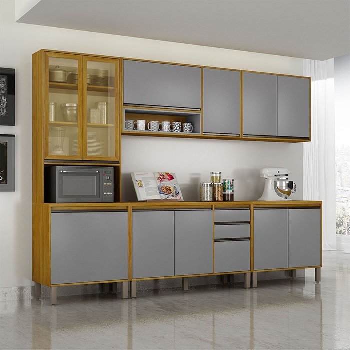 Cozinha Completa Nala com Cristaleira 5 Peças 12 Portas Mobilihouse Cinamomo/Cinza Acetinado