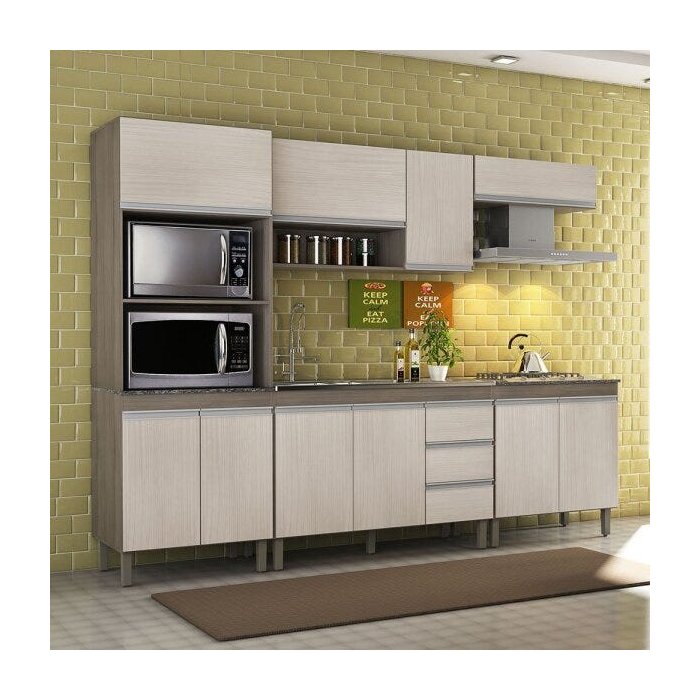 Esse modelo é composto por armários, gavetas, prateleiras, balcão e pia, oferecendo tudo o que é necessário para equipar a cozinha.