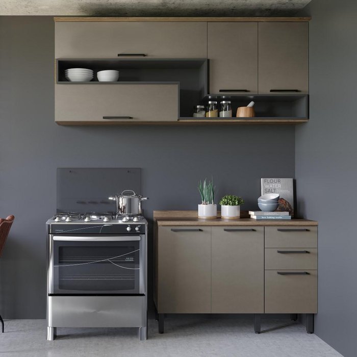 Cozinha Completa Planejada Compacta 2 Peças 6 Portas 3 Gavetas 1 Nicho 5 Pés Marrom Madeira Cinza