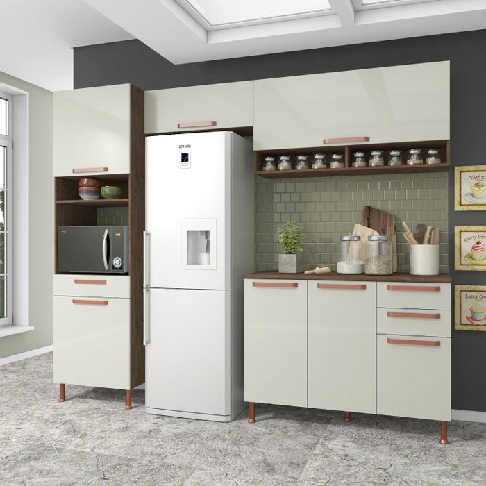 Os módulos são avulsos (cada peça é independente uma da outra) possibilitando assim vários arranjos, o espaço interno, que vem com prateleiras e divisórias, é ótimo para organização dos utensílios e mantimentos. Fabricados em material resistente, como chapas de MDP 15 MM, corrediças telescópicas e dobradiças metálicas, puxadores PVC e pés com regulagem de altura.