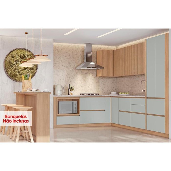 Cozinha Completa Rainha 18 Peças (3 Armários + 5 Balcões + 1 Paneleiro + 1 Ilha + 8 Complementos) C6P73 Nature/Verde - Nesher