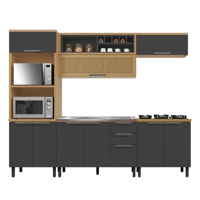 Cozinha Completa Itatiaia New Porto 350cm 4 Peças com Vidro – Preto com FreijóAposte em mais estilo, praticidade e funcionalidade com a Cozinha Completa Itatiaia New Porto 350cm, perfeita para quem busca um visual moderno com qualidade e ótimo aproveitamento de espaço. Com design contemporâneo e acabamento sofisticado em preto fosco com madeira freijó, essa cozinha transforma seu ambiente com elegância e organização.Diferenciais que fazem a diferença:Dobradiças de 35 mm com sistema Slow Motion: maior durabilidade e fechamento suave das portas, sem batidas.Gavetas com corrediças telescópicas de 3 estágios: deslizamento total, leve e eficiente.Divisor de talheres removível: praticidade para manter a organização interna das gavetas.Puxadores exclusivos para cada cor: mais personalidade e harmonia no conjunto.Estrutura inteligente com espaço para micro-ondas, forno e cooktop (pia e eletros não inclusos).Medidas do produto (montado):Altura: 220 cmLargura: 350 cmProfundidade: 53 cmPeso: 171,15 kgEspecificações:Cor: Preto com FreijóMaterial: MDP/MDF de alta resistênciaOpção sem tampoPés reguláveis que facilitam a limpeza e o nivelamentoDesign funcional e moderno com prateleiras e nichos abertosObservação: Pia e eletrodomésticos não acompanham o produto. Garantia de 6 meses contra defeitos de fabricação.Ideal para quem quer uma cozinha planejada e moderna, com excelente acabamento e espaço inteligente para o dia a dia.Linha: New Porto | Cor: Grafite | Cores: Grafite | Setor: Madeira | Situação do Produto Enviado: e desmontado na caixa | Acompanha Manual de Instalação: Sim | Recomendações Montagem: Seguir orientação de montagem conforme manual que vai junto ao produto e fixá-lo na parede. | Recomendações de Uso, Manutenção e Limpeza: Pano levemente umedecido com sabão neutro. | Garantia: 6 Meses | Material predominante: Madeira | Altura: 160 a 220 cm | Profundidade: 50 a 70 cm | Largura: 310 a 400 cm | Pode vender individualmente?: Sim | Complexidade da montagem: Médio | Necessita Montagem: Sim | Montagem e Montador: Não Inclusos