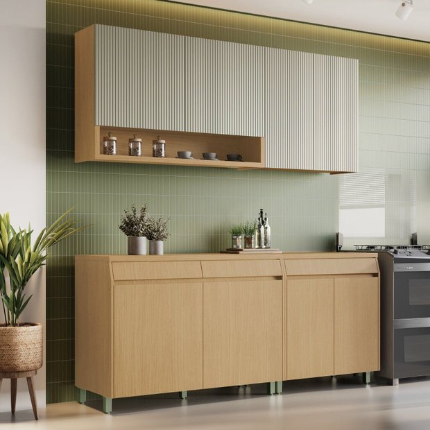 Dê um upgrade na sua cozinha com nossa cozinha completa! Com dois armários aéreos, você mantém louças, copos e utensílios sempre organizados e ao seu alcance. Já os dois balcões espaçosos oferecem o suporte ideal para guardar panelas, mantimentos e tudo o que você precisa no dia a dia. Além de prática, nossa cozinha tem um design moderno que transforma qualquer ambiente, deixando tudo mais bonito e organizado. Perfeita para quem ama praticidade sem abrir mão do estilo!
