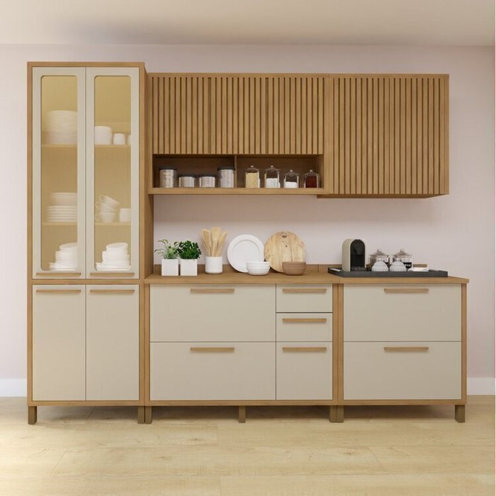 Estilo e elegância são as palavras certas para nosso conjunto de armários para cozinha. O destaque vai para o paneleiro com portas de vidro, que não só protege seus itens, mas também adiciona um toque de sofisticação à sua cozinha! Os armários aéreos com detalhes ripados dão aquele toque moderno. E para completar os móveis para cozinha espaçosa, o kit vem com dois balcões perfeitos para organizar tudo, oferecendo funcionalidade. Perfeito, não é mesmo?