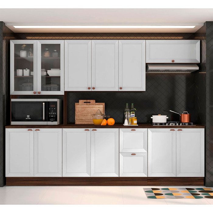 Cozinha Completa Unna 12 Portas 2 Gavetas Poliman Móveis Nogueira e Branco