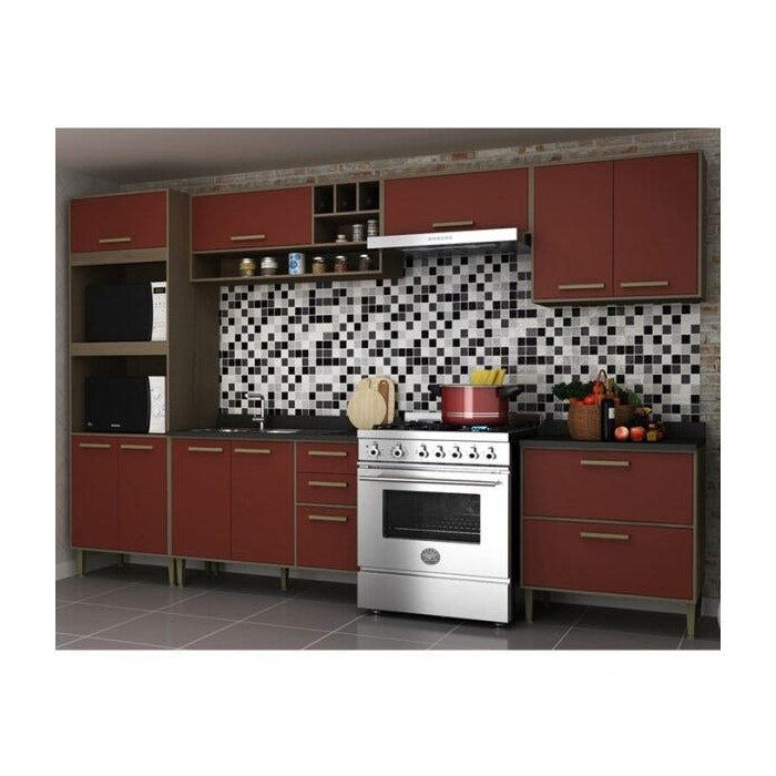 Esse modelo é composto por armários, gavetas, prateleiras, balcão e pia, oferecendo tudo o que é necessário para equipar a cozinha.