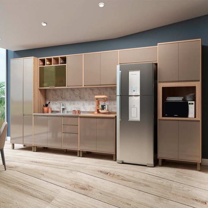 | Itens Inclusos | 1 Paneleiro Duplo P/ Microondas, 1 Paneleiro Duplo, 1 Armário Aéreo 1,20m, 1 Armário Geladeira, 1 Armário Duplo com Duas Portas, 1 Balcão Triplo e 1 Balcão Duplo com Duas Portas; Manual de montagem, Ferragens e Acessórios |