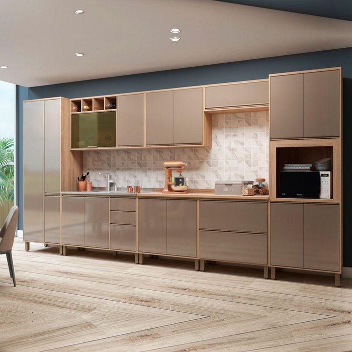 | Itens Inclusos | 1 Paneleiro Duplo P/ Microondas, 1 Paneleiro Duplo, 1 Armário Aéreo 1,20m, 1 Armário Geladeira, 1 Armário Duplo, 1 Balcão Triplo, 1 Balcão Duplo com Duas Gavetas e 1 Balcão Duplo com Duas Portas; Manual de montagem, Ferragens e Acessórios |