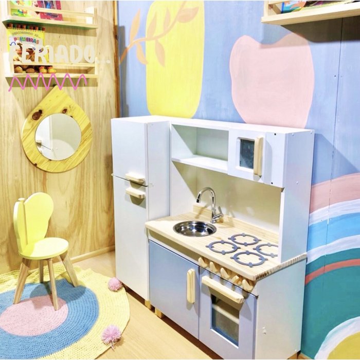 Descrição: Produzida em MDF 15mm na cor branca com 2 portas coloridas no armário e fogão.
