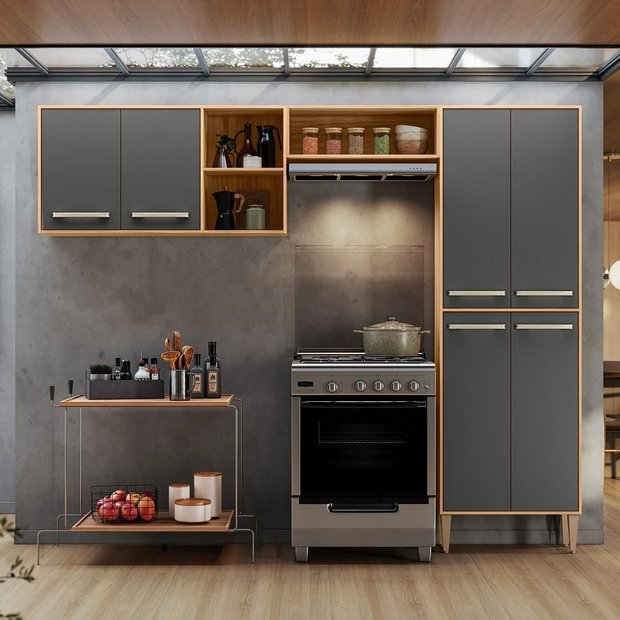 A Cozinha Mariah é uma ótima opção para você que busca um produto completo e com um designer moderno. A Cozinha é composta por 6 portas com dobradiças em aço, possui 4 prateleiras. Uma ótima opção para você que busca espaço para armazenamento. Cozinha em MDP com acabamento em pintura UV. Medidas do produto montado: