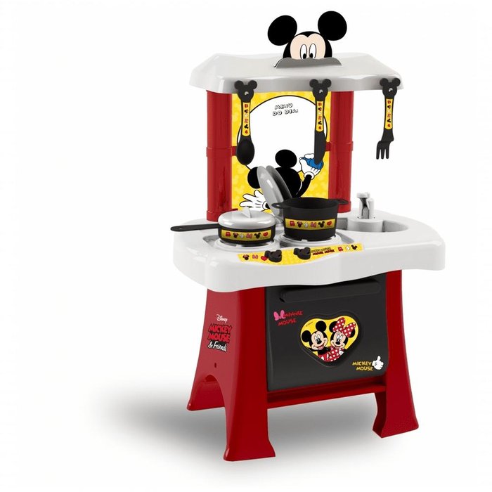 A Cozinha Mickey Disney com design inovador e cheia de estilo possui pia, fogão, forno e coifa em um único produto. O botão que gira e faz barulho creck-creck. Acompanha ainda utensílios de cozinha como pratos, talheres, panela e frigideira. A caixa contém ilustrações destacáveis que compõem o produto. Brinquedo que permite a criança imitar, imaginar, criar, simular e reproduzir situações do cotidiano familiar. Estimula e desenvolve o aprendizado infantil através do faz de conta, a organização e a utilização dos utensílios da cozinha. Uma excelente opção para presentear crianças a partir dos 3 anos de idade.