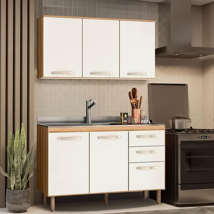 Estrutura em MDP: Fabricado com material resistente e durável, garantindo qualidade e excelente custo-benefício.Conjunto de 2 Peças: Composto por um armário aéreo e um balcão, oferecendo funcionalidade e organização para sua cozinha.5 Portas com Amplo Espaço Interno: Ideal para armazenar utensílios, mantimentos e outros itens do dia a dia de forma prática e organizada.3 Gavetas com Corrediças Telescópicas: Deslize suave e acesso facilitado aos itens armazenados, perfeito para talheres e acessórios.Balcão com Tampo: Acompanha um tampo resistente que pode ser utilizado com pia de 1,20m, trazendo versatilidade ao ambiente.Prateleiras Internas: Divisões inteligentes que otimizam o espaço e facilitam a organização dos itens.Não Acompanha Pia: Flexibilidade para o cliente escolher o modelo de pia que melhor atende às suas preferências.Dimensões do Armário Aéreo: Largura 120 cm; Profundidade 29 cm; Altura 61 cm.Dimensões do Balcão: Largura 118 cm; Profundidade 51 cm; Altura 84 cm.Itens Inclusos: 1 armário aéreo e 1 balcãoComplexidade da montagem: Média, recomendamos que seja feita por um profissional de montagem qualificado.Recomendações de uso, manutenção e limpeza: Limpar com flanela ou pano macio seco, não utilizar produtos abrasivos, desengordurantes, álcool ou solvente. Não expor o produto diretamente a luz solar e à umidadeGarantia: 3 mesesOBS: Foto meramente ilustrativa, objetos, utensílios e decoração não fazem parte do produto.