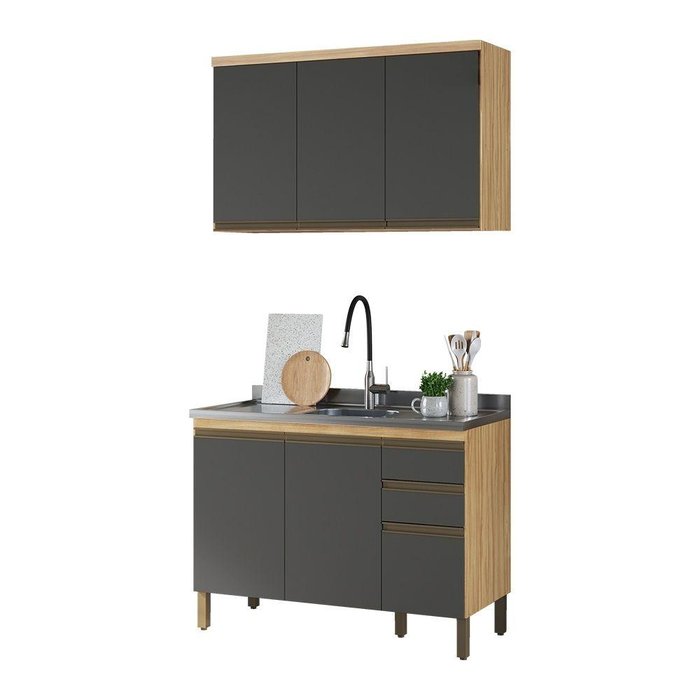 Cozinha Modulada 2 Peças 6 Portas e 2 Gavetas sem Tampo Chardonnay Móveis Riodoce Amêndoa/chumbo Amêndoa/Chumbo