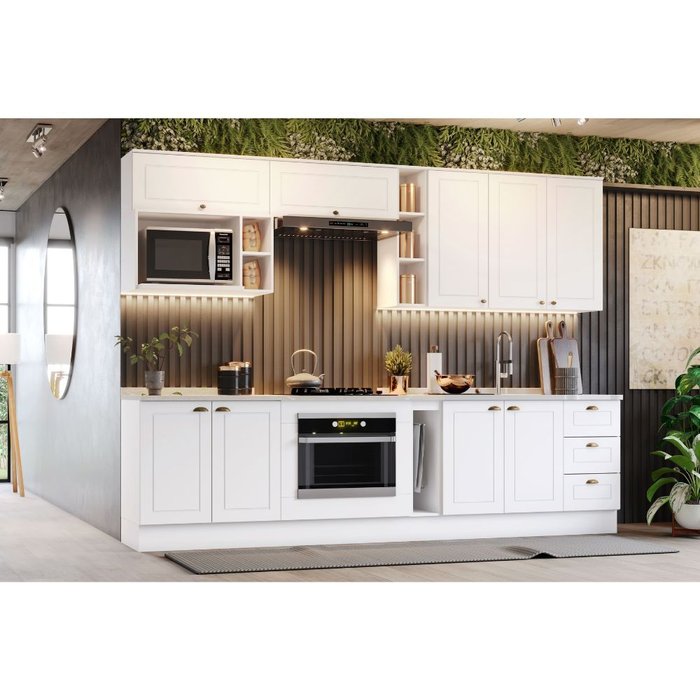 Cozinha Modulada 300cm com Espaço para Cooktop Forno de Embutir e Nicho de Micro-ondas 9 Portas 3 Ga Branco