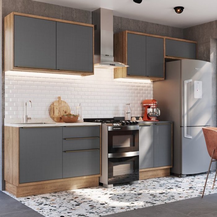 Cozinha Modulada 5 Peças 8 Portas 3 Gavetas com Divisor de Talheres Viena Louro Freijó/Cinza Grafitto