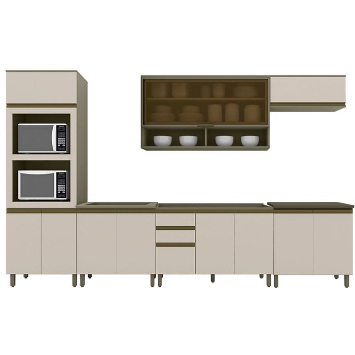 Cozinha Modulada 8 Peças Evy, Ótima escolha para a cozinha dos sonhos, sua estrutura de alta durabilidade em 100% MDF de 3 e 15 mm, acabamento com pintura UV na cor Duna Cristal (Fosco). Composto por portas com dobradiças metálicas de 35 mm com amortecimento permitindo fechamento leve e suave, pistão a gás, vidro reflecta e nicho. Gavetas com corrediças telescópicas, cada gaveta suporta 3 kg distribuídos, divisórias internas que suporta até 8 kg distribuídos. Balcão com dupla opção de montagem, espaços para forno e micro-ondas, puxador na cor Bronze. Acompanha pés de 14,5 cm com regulagem de 2,5 cm chegando a 17 cm. Balcões de 80 cm acompanham dois tampo em MDF, sendo um para cooktop, usinado para cooktop de 04 bocas, com pré marcação para cooktop de 05 bocas. Esta Cozinha Modulada possui diversos módulos avulsos que são vendidos separadamente, para você montar a sua cozinha como sempre sonhou, foi elaborado para quem tem estilo e personalidade. Estes móveis chegarão em sua casa separados em 09 volumes.