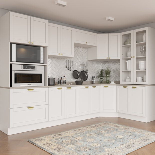 Cozinha Modulada com tampo formada por 4 Aéreos 4 Balcões e 1 Torre Quente, as portas e frentes de gaveta são feitas em MDF e possuem acabamento em Finish Foil com dobradiças com amortecimento, possibilitando fechamento soft closing. Possuem fita de borda em PVC, conferindo alta durabilidade e proteção contra umidade ao móvel.