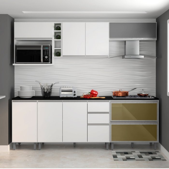 Cozinha Modulada Aérea 8 Portas 4 Gavetas Evidence Poliman Móveis Branco/Prata