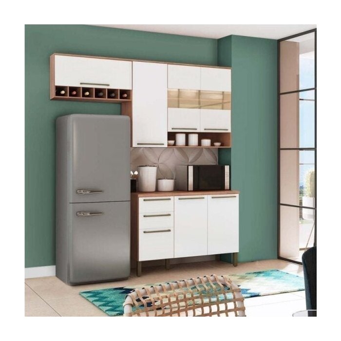 Cozinha compacta 100% MDF, pensada para ambientes pequenos, porém oferecendo o máximo de funcionalidade e beleza. Composta por 3 peças com módulos e divisões pensados para sua perfeita organização. Com 1 armário aéreo de 120cm com 3 portas detalhes em vidro reflecta, 1 armário aéreo 80cm com porta basculante e 1 Balcão de 120cm com 3 portas, 2 gavetas e tampo. Os módulos são montados individualmente e podem ser fixados da forma que melhor se adequem ao seu espaço.