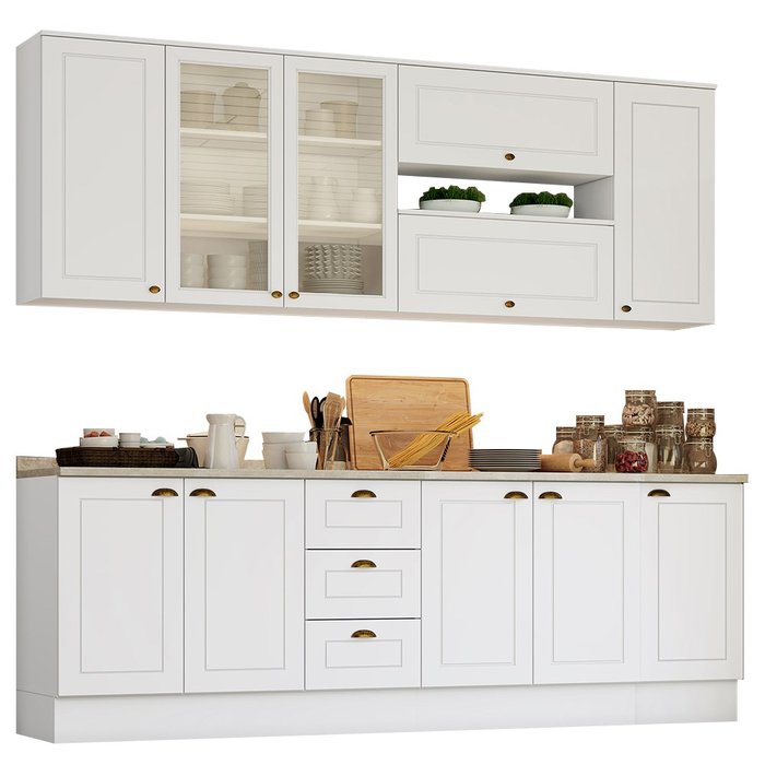Conteúdo da Embalagem: 2 Armários Aéreos porta basculante,1 armário aéreo 40cm, 1 Armário Aéreo 3 portas, 1 balcão 80cm, 1 balcão 40cm, 1 balcão 120cm, 1 tampo 120cm, 1 tampo 80cm, 1 tampo 40cm.