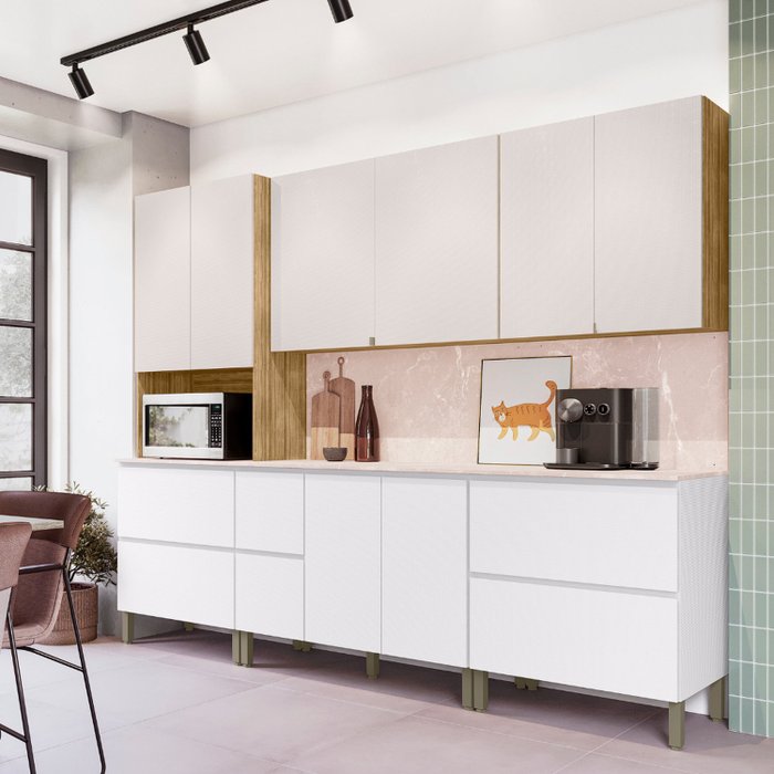 Cozinha Modulada Completa 7 peças 9 Portas 4 Gavetas Balcão com Tampo e Painel Art Freijó/Ártico/CP Soft