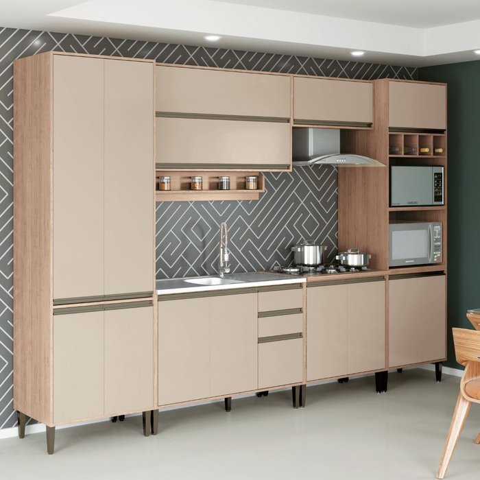 A Cozinha Catharina chegou com tudo, moderna e sofisticada , trata-se de uma Cozinha Modulada, possui 14 Portas e 3 Gavetas, fabricada 100% MDF na cor Amadeirado/Nude