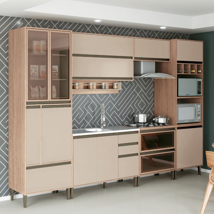 Cozinha Modulada Completa Catharina Com Vidro Reflecta 7 Peças em MDF Amadeirado Nude