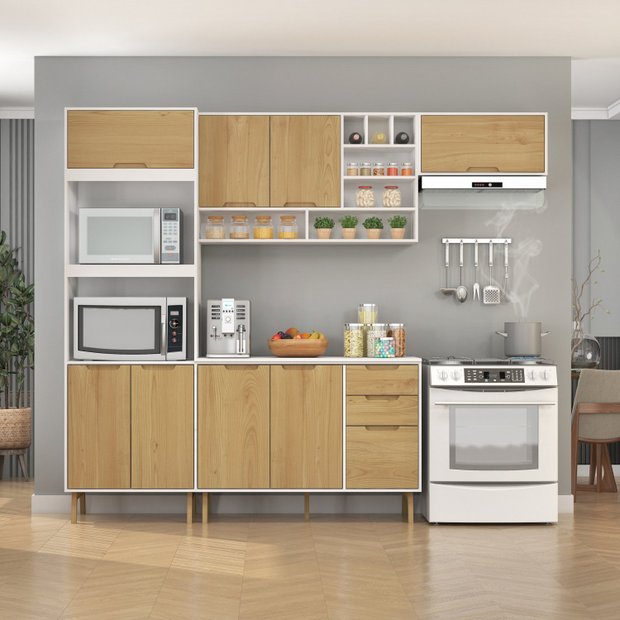 Usar madeira na cozinha é uma tendência de decoração que nunca sai de moda, este material por si só entrega sofisticação, elegância e atemporalidade. Para dar à sua cozinha uma aparência única aposte na Cozinha Modulada Wood que irá combinar perfeitamente com as necessidades do seu dia-a-dia. A Cozinha completa é composta por 5 módulos, sendo: torre quente para forno e micro-ondas, aéreo e balcão de pia c/tampo, aéreo de 70cm. O principal diferencial são as portas embutidas em madeira pinus e os pés de madeira de 17cm que garantem elegância e exclusividade. As gavetas possuem corrediças telescópicas garantindo total abertura e ainda possibilitando um deslizamento suave, firme e silencioso. As gavetas são montadas com minifix garantindo montagem firme e segura. Os puxadores são usinados.