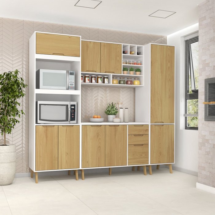 Cozinha Modulada Completa com Tampo 5 Peças 9 Portas 3 Gavetas Branco/Wood