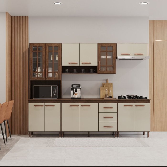 Com módulos avulsos, cada peça é independente, permitindo diferentes composições para melhor aproveitamento do espaço. Seu interior é bem distribuído, com prateleiras e divisórias que auxiliam na organização de utensílios e mantimentos.