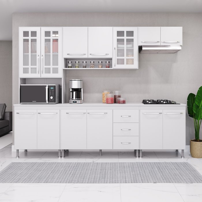 Cozinha Modulada Completa Fidelitá Viena 5 Peças 260cm 13 Portas 3 Gavetas com Tampo Branco