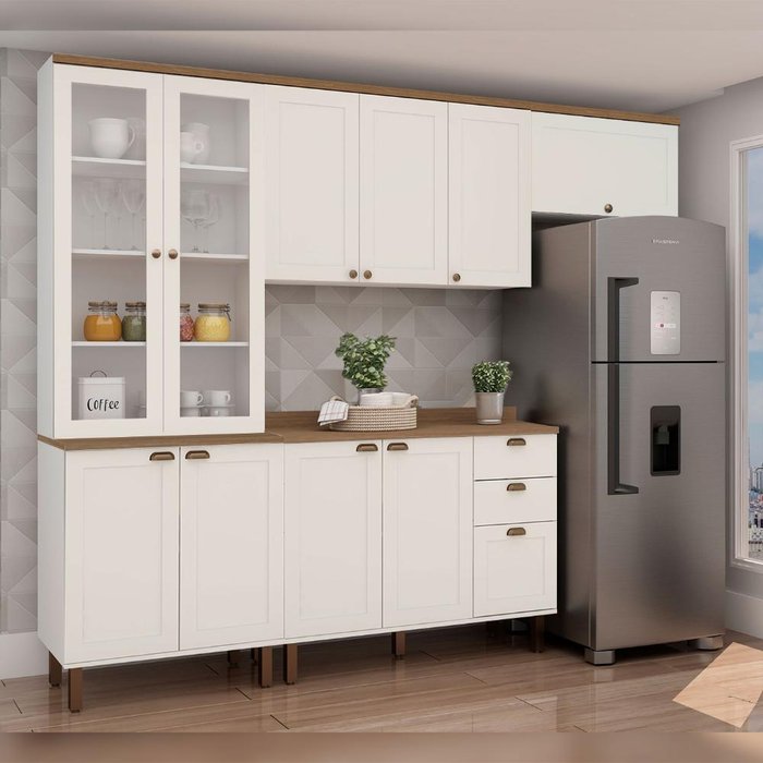 Esse modelo é composto por armários, gavetas, prateleiras, balcão e pia, oferecendo tudo o que é necessário para equipar a cozinha.