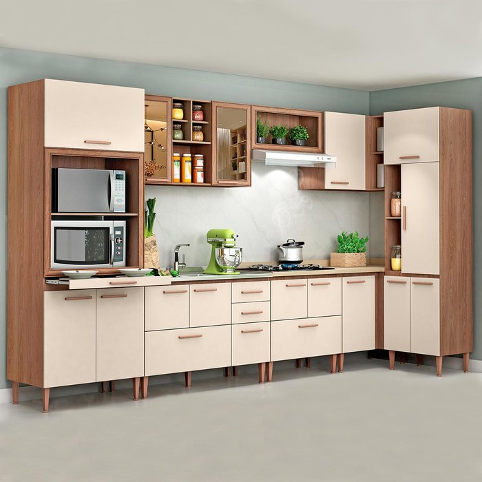 Cozinha Modulada de Canto Completa Style 360x112 Cm Vidro Reflecta MDP Nogueira Champagne - ClickLar