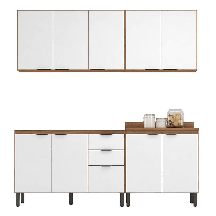 Composta por armários, gavetas, prateleiras, balcão para pia, oferece tudo o que é necessário para ter uma cozinha completa.
